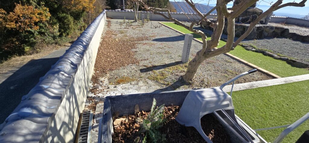 昨年2024年度に慰霊碑周辺の庭園は人口芝生を施し全体を整備したので草刈り労力が軽減されましたが、枯葉が物凄い量です。(笑)側溝やカイショを設けたことで水はけも良くなりましたが、側溝とカイショの掃除も大変。