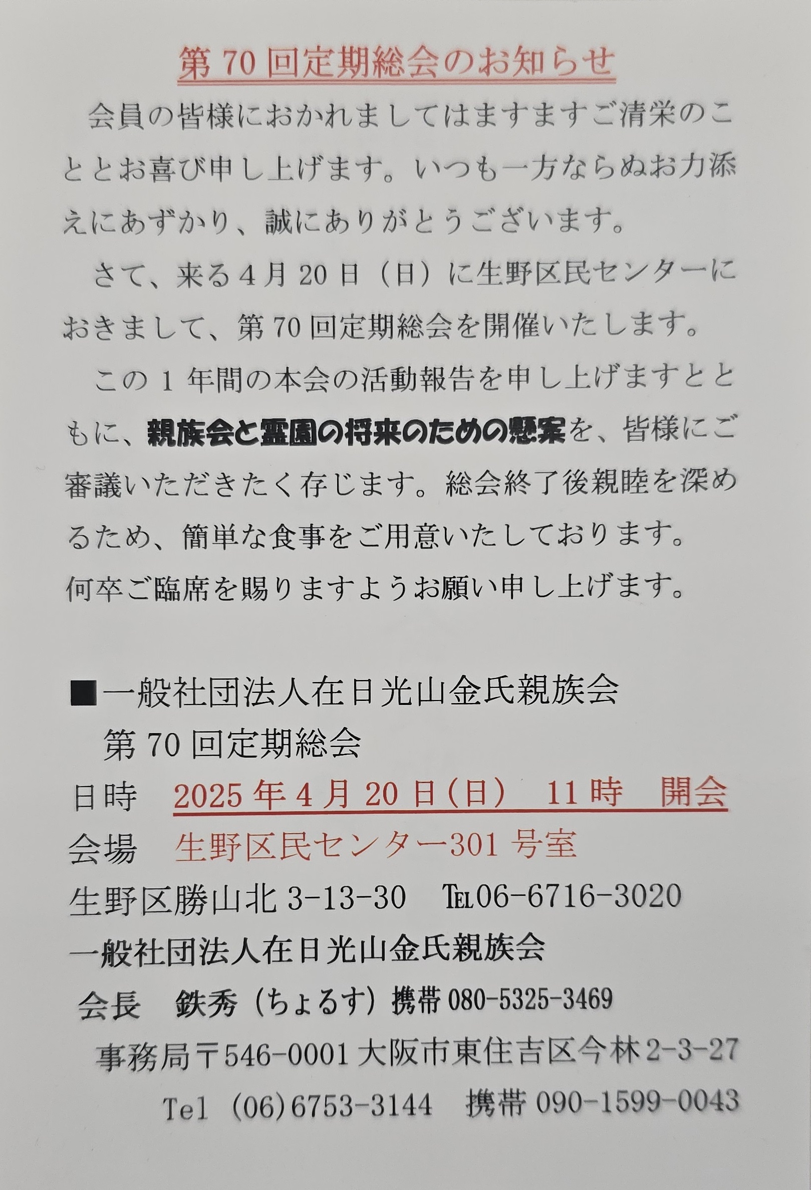 在日光山金氏親族会 第70回 定期総会のお知らせ 2025.04.08