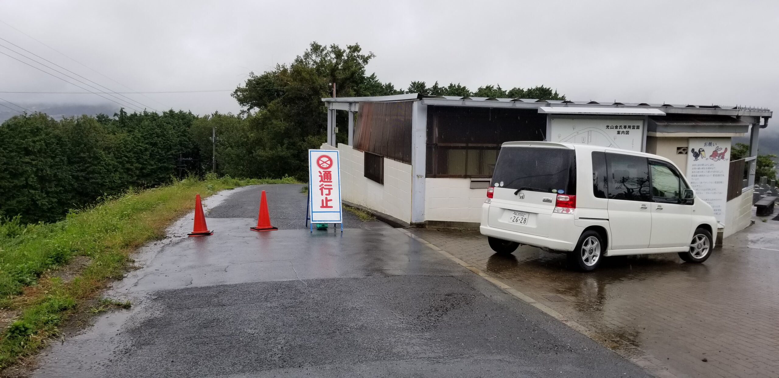 平素は親族会の活動にご協力を賜り、心より御礼中し上げます。去る10月の台風による大雨により、親族会専用霊園の駐車場側擁壁が崩落し、大量の土砂が側道を塞いでしまうという被害が生じました。(写真参照)光山金氏親族会の象徴である霊園がこのような状態になってしまい、関係者一同大変心を痛めております。