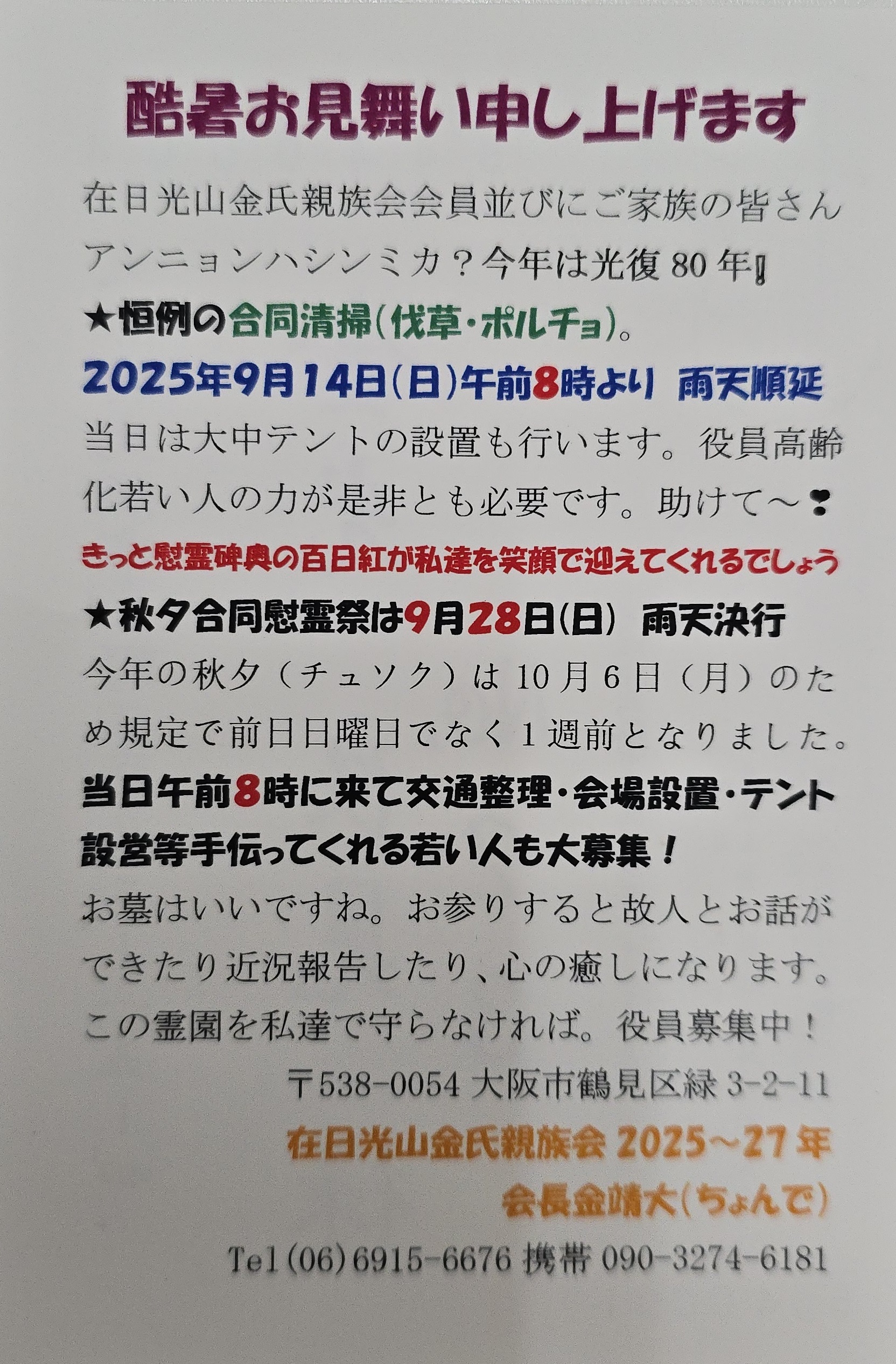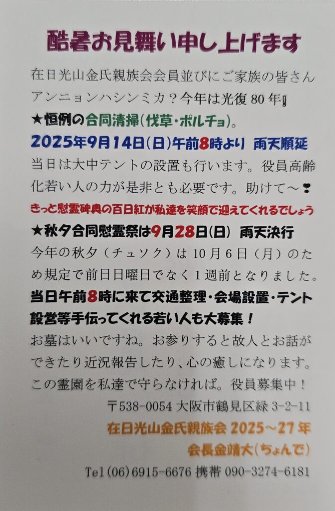 4. 光山金氏専用霊園秋夕慰霊祭前の清掃と設営を実施します! 2025年9月14日(日曜)