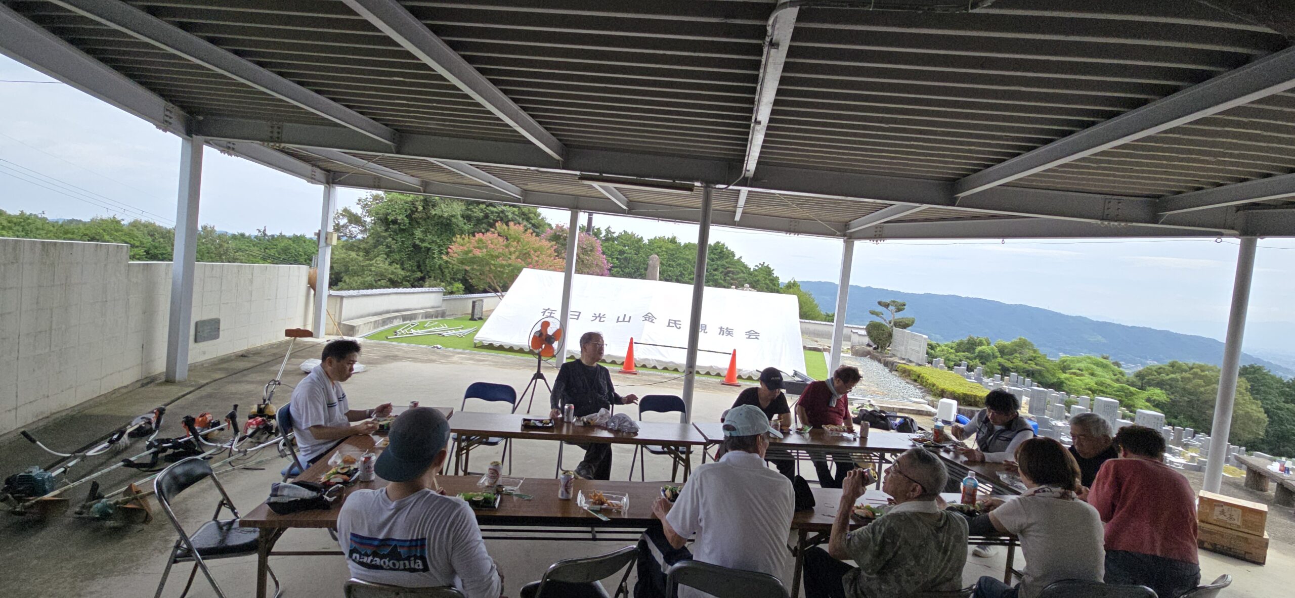 自分たちは協力し合って草刈りをすることに意義があることを感じボランティア草刈りに参加しています。外注で草刈りをお願いする事は簡単な事ですが、霊園の運営にも年間数回行うと莫大な経費支出が発生します。役員、顧問、OBは霊園から支出が発生する恩恵は一切受けていません。草刈りの時だけお昼前に支給されたお弁当とお茶を頂き解散します。