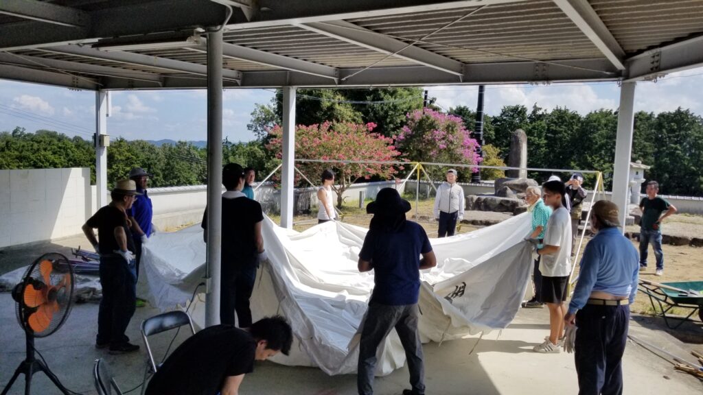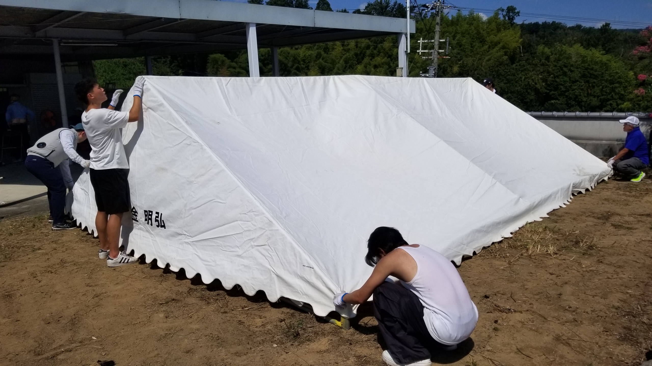 草刈りなどを終え。残りの作業が来週に控えた秋夕慰霊祭の準備物としてテントの設営です。結構重いのでみんなで声を掛け合って組み立てていきます。この時に何故か思ったのですが、一丸となったような気分になりました。
