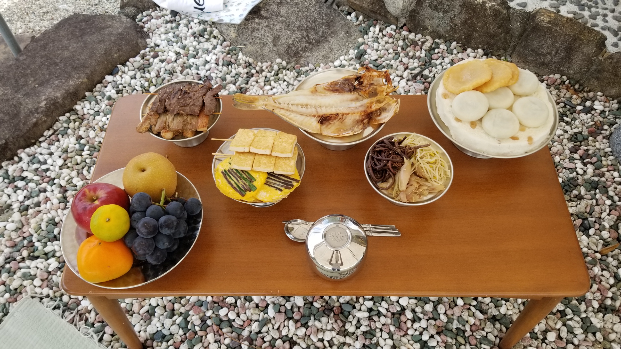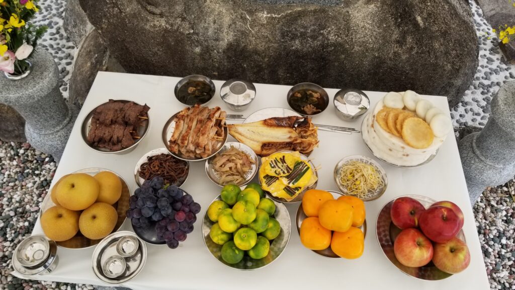 郷土伝統祭祀では大きな庭に家が在り、御門から自宅玄関まで10m以上。庭の周囲は1.5m程の高さの土塀で覆われていて、門扉は木製で重厚な大きな観音開き門と勝手口を想像してください。(韓国のドラマで見た知識からです)故人がお亡くなりになった前日の深夜11時半過ぎから、大きな御門を開け中庭内では御門の方へ向けて門前机(ムンジョンサン)を配膳し、ロウソクを燈し線香を焚き、維歳次を読み上げ、先祖(霊魂)を自宅内にお呼びします。違った霊魂も呼び込んだりしますので、配膳した食事を一種類ごと取り分けて酒杯盃にまとめて入れて門の外の柱隅に流し置きます。盃は引き続き使用しますので自宅内に持ち込みます。