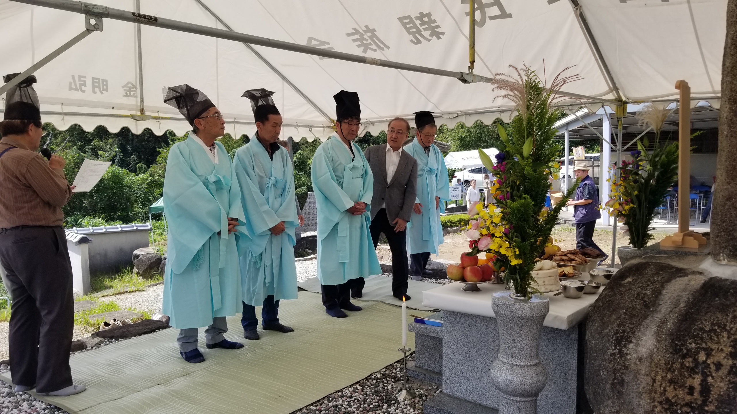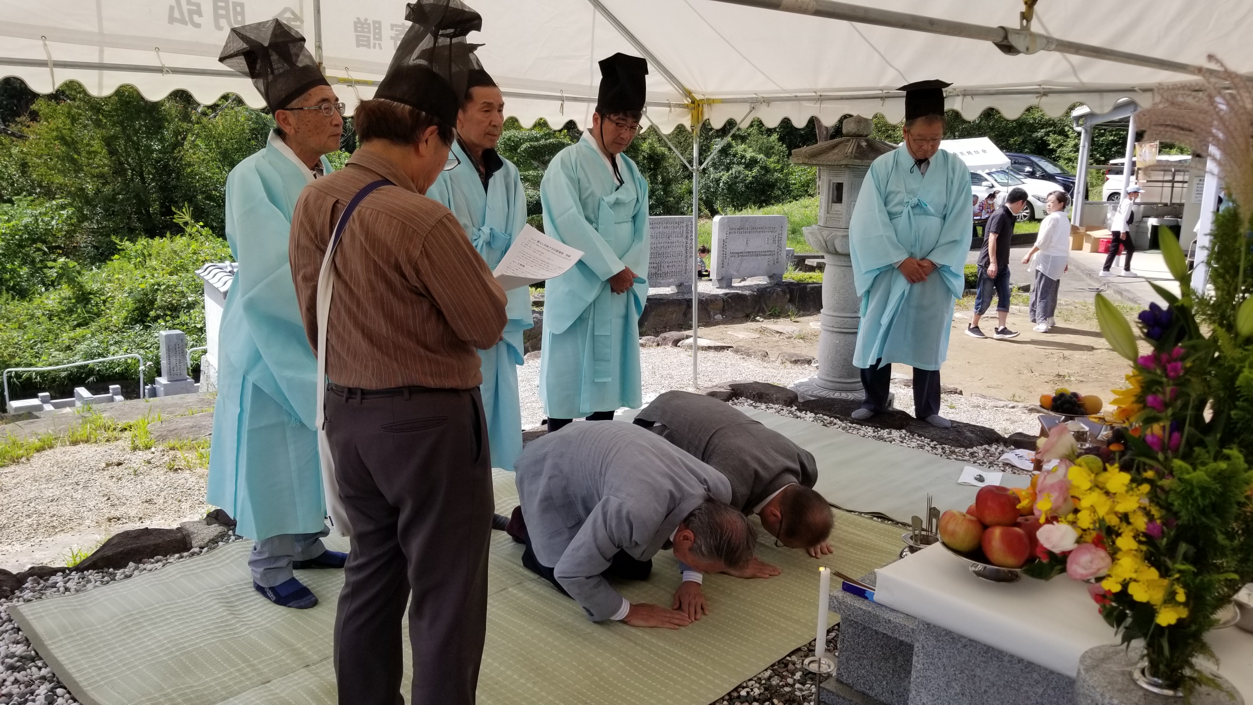 秋夕慰霊祭 祭祀(チェサ)を只今よりおこなう前に、慰霊碑前でご先祖さまへのご挨拶をおこなう右執事と左執事。