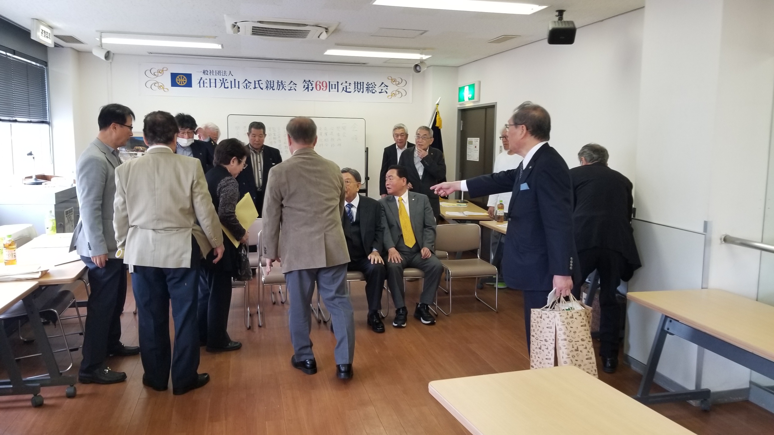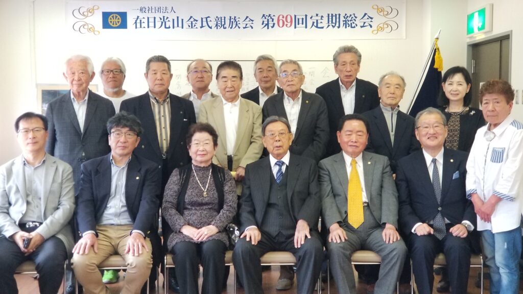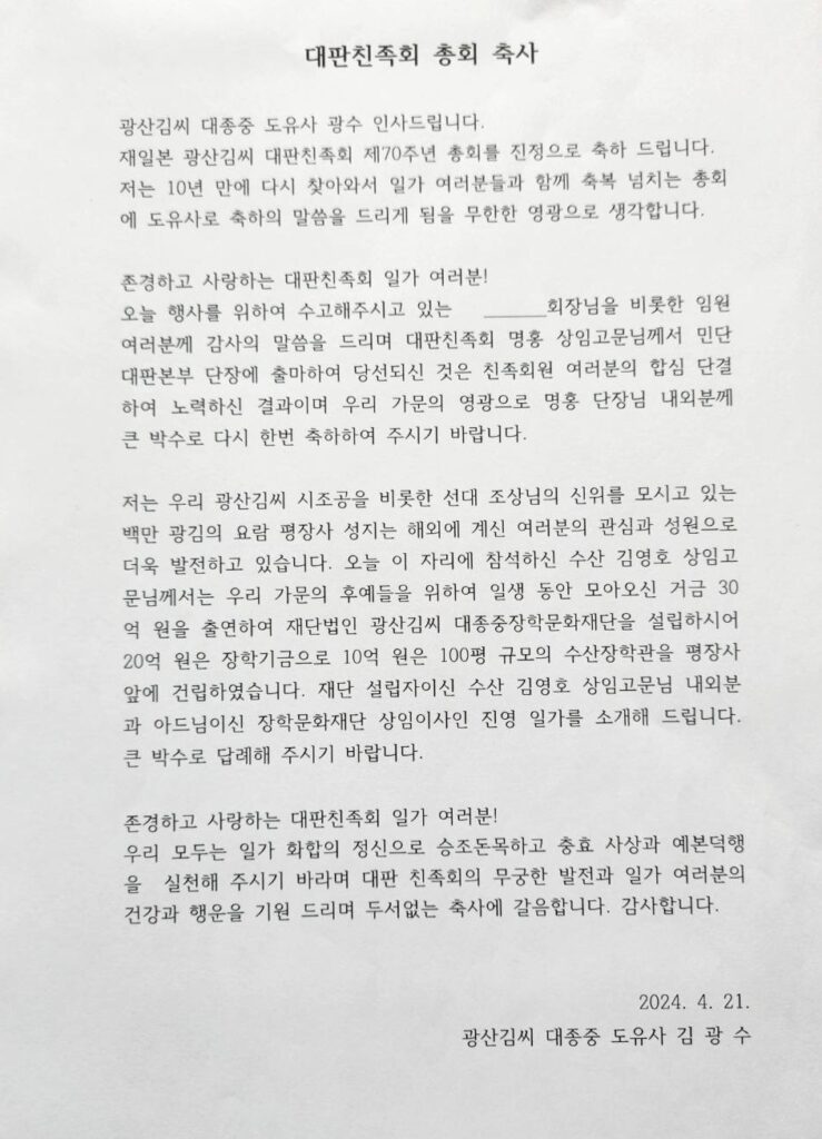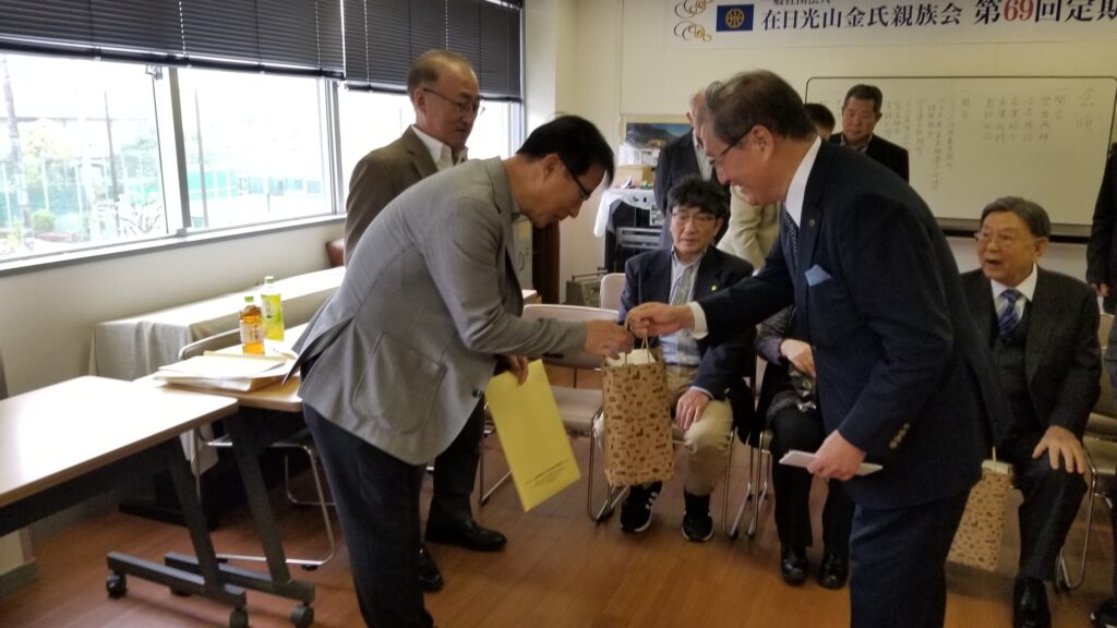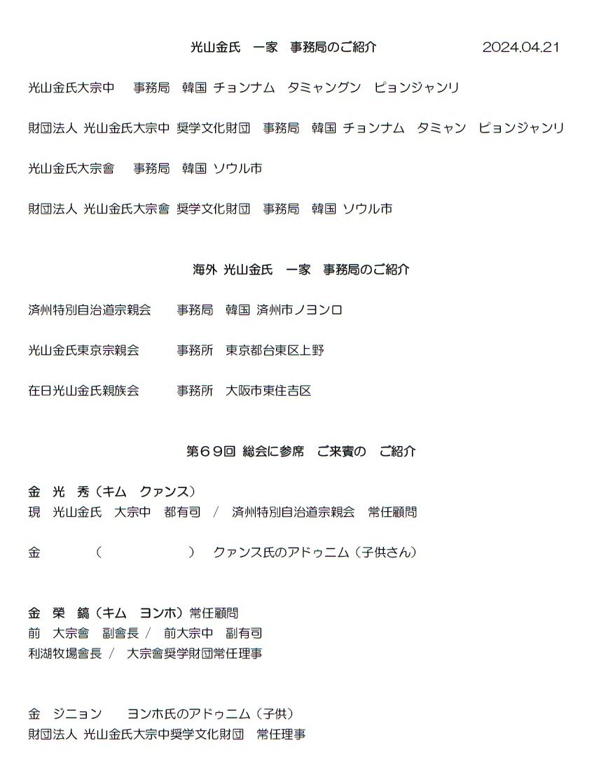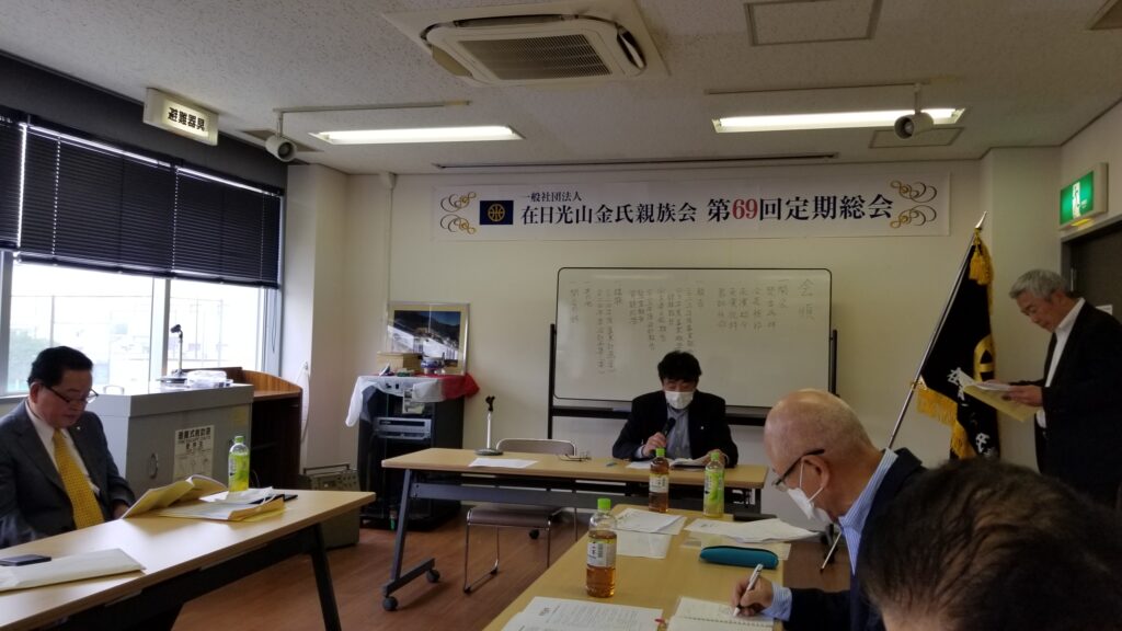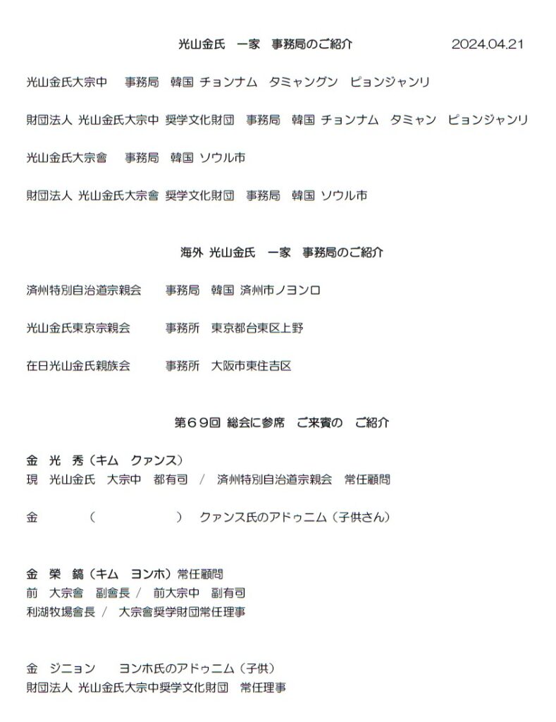 第69回定期総会は2024年年4月21日生野の区民ホールで開催。 本国からご来賓として、済州特別自治道宗親会 常任顧問であり、現 光山金氏 大宗中 都有司であられる 金 光 秀(キム クァンス)氏、同じくご来賓として  金 榮 鎬(キム ヨンホ)氏は済州特別自治道宗親会 常任顧問 前 大宗會 副會長 / 前大宗中 副有司 利湖牧場會長 / 大宗會奨学財団常任理事 であられます。そして、付き添われたご家族の方もご参席されました。総会では例年おこなわれる会計年度の決算収支報告並びに次回年度の予算報告などがおこなわれました。その後、来賓の方のご紹介をおこない、ご来賓を代表して金 光 秀(キム クァンス)氏からご挨拶と祝辞を頂きました。