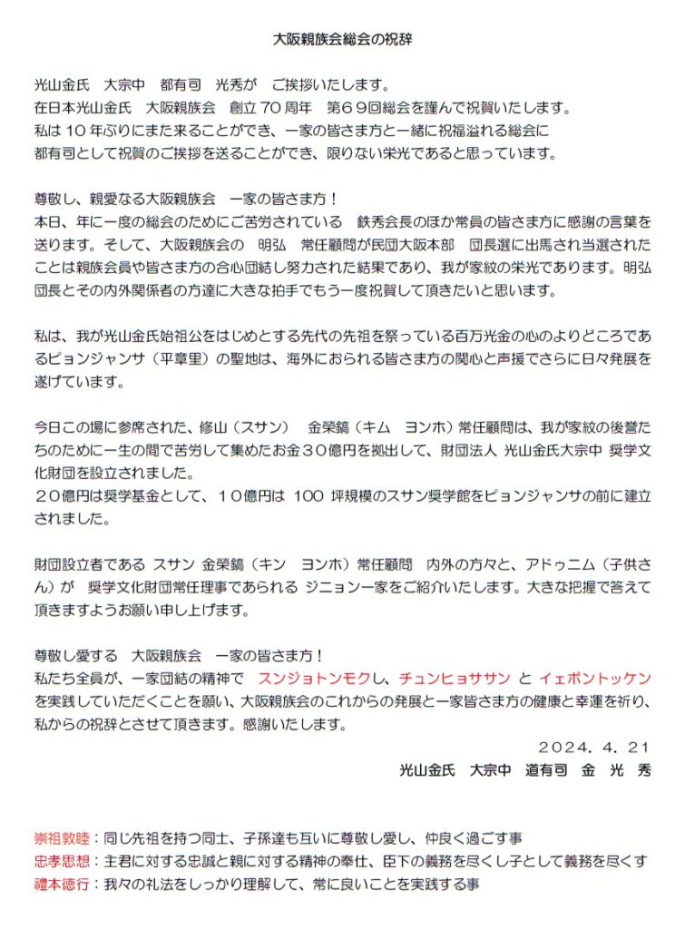 第69回定期総会 ご来賓 光山金氏大宗中 都有司 光秀氏より祝辞 2024.04.21